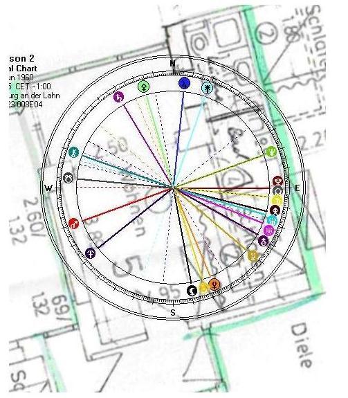 Erfahren Sie mehr über die Wirkung von Planetenlinien im Wohnbereich . Dabei kombiniert man einen Grundriss mit dem standortastrologischem Horoskop: Man kann die Daten eines Horoskops auf einen Wohnungsgrundriss oder Hausgrundriss projizieren und erhält verblüffend stimmige Aussagen darüber, ob und vor allem warum man sich in bestimmten Bereichen der Wohnung wohl oder unwohl fühlt. Es wirken nicht nur eventuelle geologische Störzonen, Wasseradern oder Elektrosmog im Wohnbereich, sondern auch die persönlichen Konstellationen. Für eine standortastrologische Beratung, die Erstellung einer Horoskopgrafik auf einem Grundriss benötige ich eine Grundrisszeichnung von Hause/Grundstück, Etage/Wohnung/Zimmer mit eingezeichneter Nordrichtung
